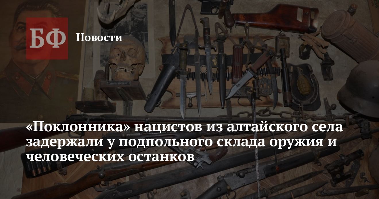 Как сообщила пресс-группа УФСБ России по Республике Алтай, результате операции из незаконного оборота изъяли 15 единиц огнестрельного нарезного и гладкоствольного оружия, пистолет ПСМ, два пистолета Макарова, пистолет «Глок», два револьвера, пять стволов для пистолетов, более 2 тысяч боеприпасов различного калибра, ударно-спусковые механизмы, оборудование для изготовления патронов. Кроме того, в ходе обыска обнаружены более 20 единиц холодного оружия с нацистской символикой, нацистская литература, а также человеческие останки.