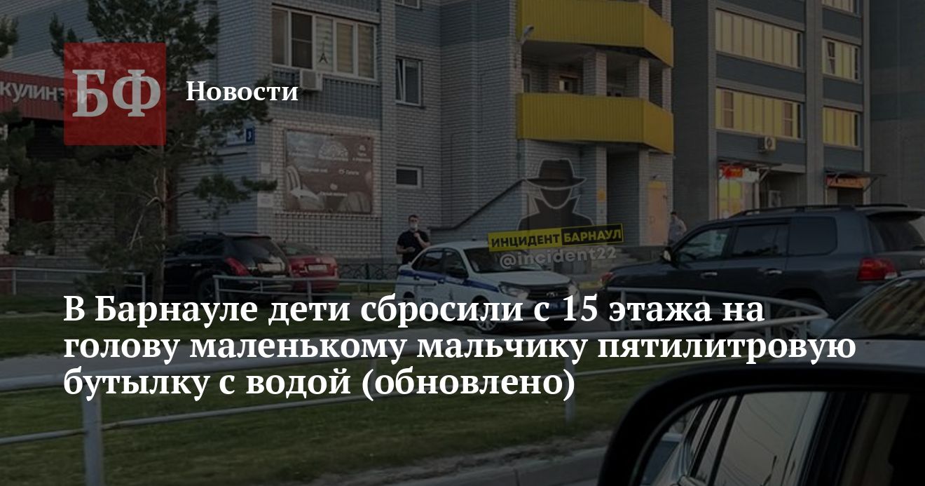 Вечером 2 июня в Барнауле на улице Взлетной произошел инцидент, в ходе которого пострадал маленький ребенок. Как пишут пользователи соцсетей, другие дети сбросили ему на голову пятилитровую бутылку с водой с высоты 15 этажа. Пострадавшего увезли на скорой. Правоохранительные органы пока не уточняют обстоятельства произошедшего.