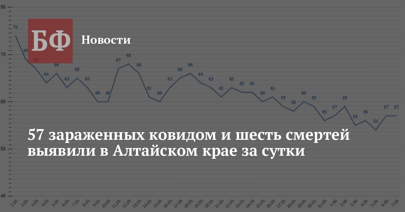 7 июня в регионе обнаружили 57 зараженных COVID-19. По муниципалитетам: Барнаул — 24, Бийск — восемь, Камень-на-Оби, Рубцовск, Бийский, Благовещенский, Павловский районы — по три, Заринск, Бурлинский, Егорьевский, Заринский, Зональный, Красногорский, Кулундинский, Поспелихинский, Суетский, Табунский районы — по одному.