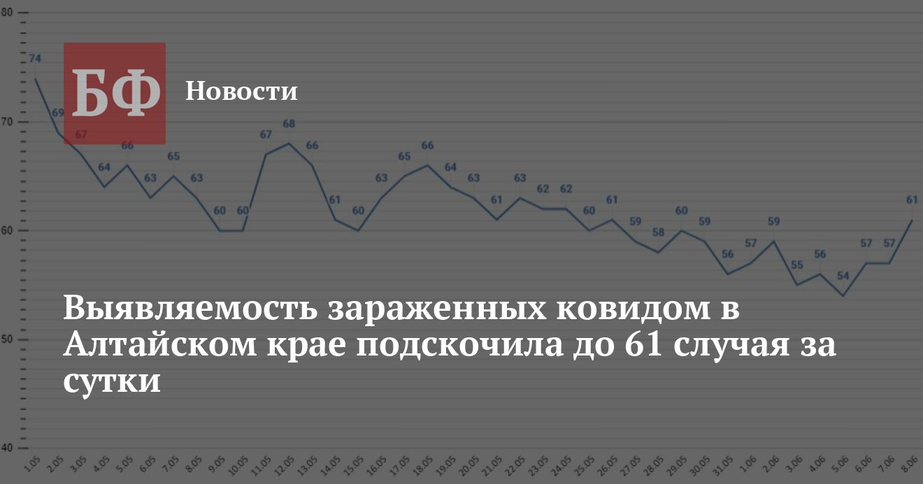 8 июня в регионе зафиксировали 61 случай COVID-19. По муниципалитетам: Барнаул — 29, Бийск — семь, Павловский район — шесть, Благовещенский район — три, Алейск, Камень-на-Оби — по два, Новоалтайск, Рубцовск, Славгород, Алейский, Волчихинский, Егорьевский, Калманский, Каменский, Михайловский, Тальменский, Топчихинский, Угловский районы — по одному.