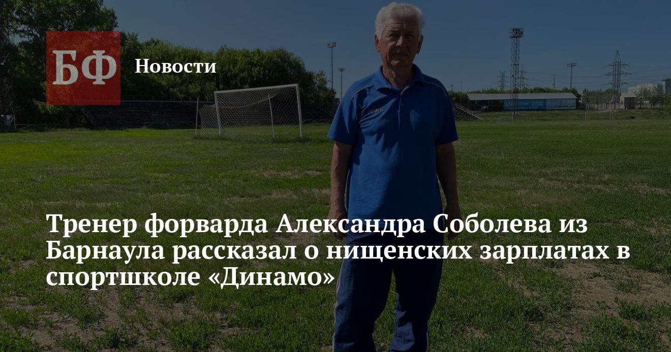 Спортшкола «Динамо» в Барнауле, в которой в детстве и юности воспитывался футболист сборной России Александр Соболев, терпит не лучшие времена, впрочем, и в период становления именитого спортсмена тренеры получали нищенские зарплаты, а состояние стадиона и залов оставляло желать лучшего. Об этом в интервью корреспонденту Sports.ru рассказал тренер Соболева Александр Горбунов, который всю свою жизнь посвятил развитию барнаульского футбола. Он сообщил, что средств недостаточно, а потому средняя зарплата в спортшколе — 20 тысяч рублей. При этом выплаты за переходы подающих надежды воспитанника «Динамо» в другие клубы порой либо ничтожны, либо вообще не доходят до тренера. Причина в том числе в смене юрлиц — такая схема позволяла уйти от долгов. Вместе с тем, детей приходится тренировать на кривом поле, напоминающем огород, и залах с осыпающимся вместе со штукатуркой бетоном. Однако даже эти факторы не мешают барнаульским педагогам ковать профессиональные кадры для сборной.