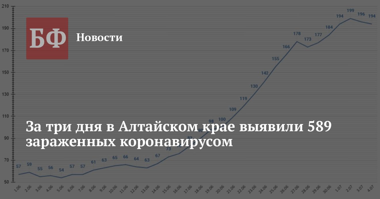 В период со 2 по 4 июля в регионе зафиксировали 589 случаев ковида. В последние два дня динамика пошла на спад, не преодолев барьер в 200 зараженных. В Барнауле зарегистрировали 242 инфицированных, в Бийске — 83, в Рубцовске — 16.