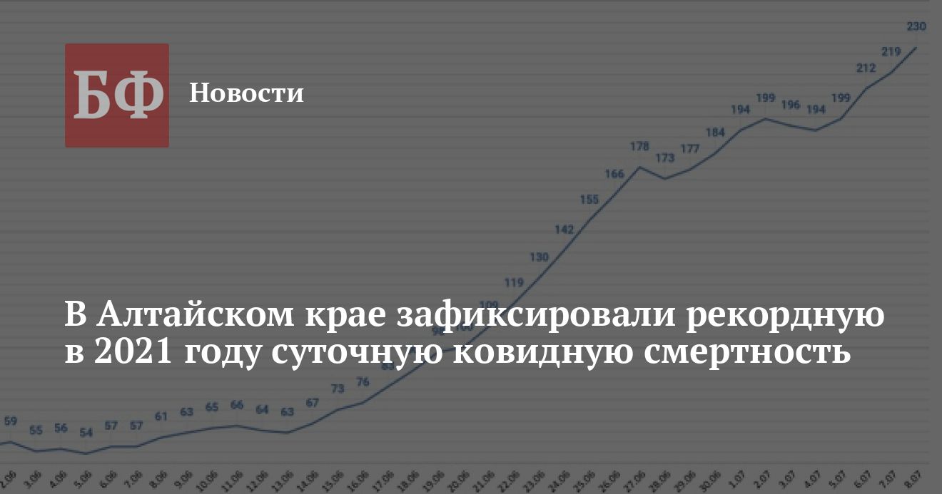 Суточная «норма» заболеваемости коронавирусом в Алтайском крае продолжает набирать обороты. 8 июля в регионе было зарегистрировано 230 новых случаев заражения. При этом выздоровели 53 пациента. Смертность среди пациентов с ковидом тоже растет с каждым днем — накануне в крае умерло 17 человек, от COVID-19 — 15. Таких показателей в текущем году еще не фиксировали, и это повторение рекорда за все время пандемии.