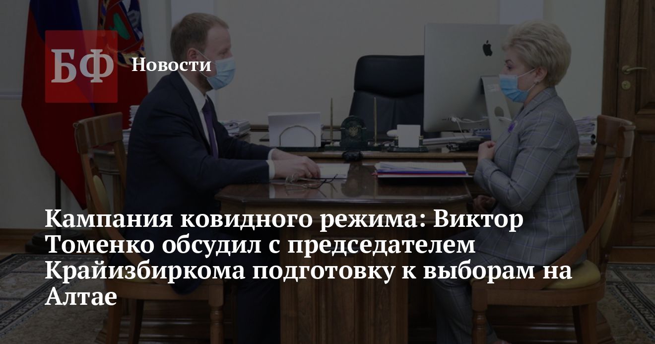 Губернатор Алтайского края Виктор Томенко 9 июля провел рабочую встречу с председателем краевой избирательной комиссии Ириной Акимовой. Темой беседы стала подготовка к выборам депутатов Госдумы, Алтайского Заксобрания, а также муниципальных депутатов, которые пройдут 17, 18 и 19 сентября. Так, Томенко уточнил, что антиковидные ограничения не помешают процессу, а Акимова отчиталась о текущей стадии избирательной кампании.