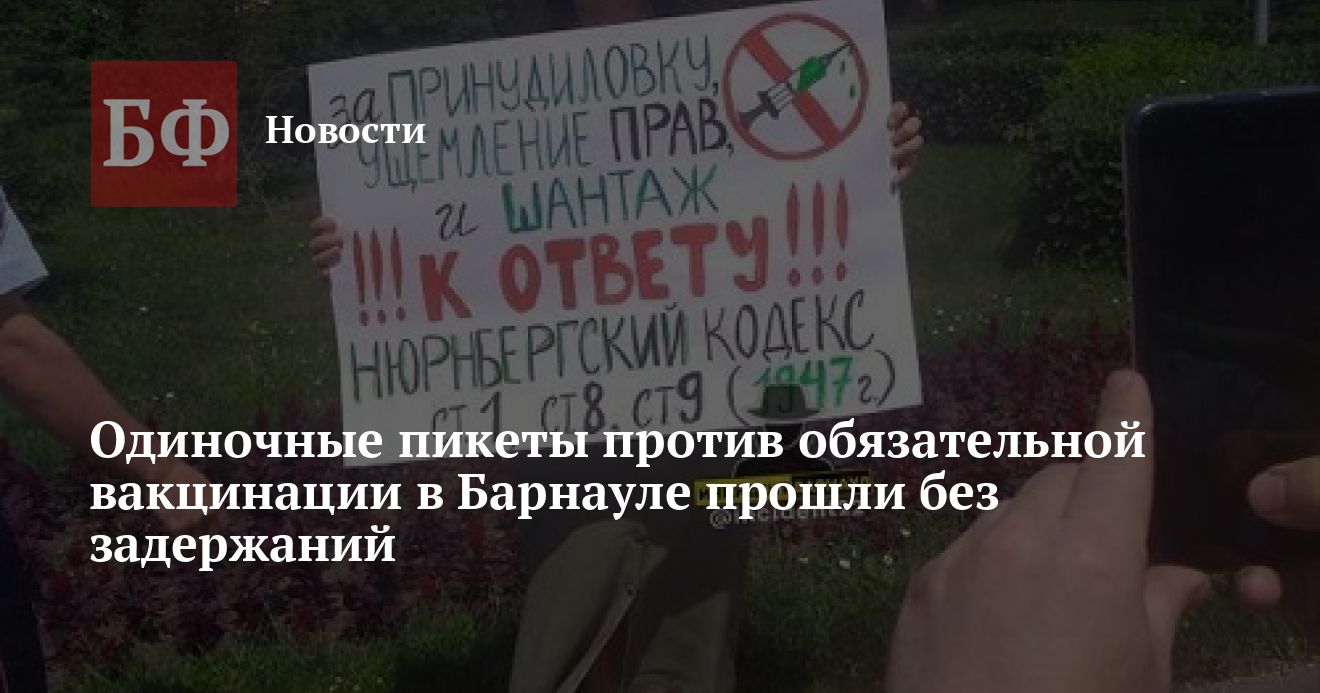 Тем не менее, 11 июля барнаульцы, недовольные обязательной вакцинацией, все же вышли с плакатами. Они провели серию одиночных пикетов. Судя по опубликованным фото, за участниками наблюдали сотрудники МВД. Одна из организаторов несостоявшейся акции сообщила «Банкфаксу», что задержанных не было, каких-либо протоколов на пикетчиков также не составляли.