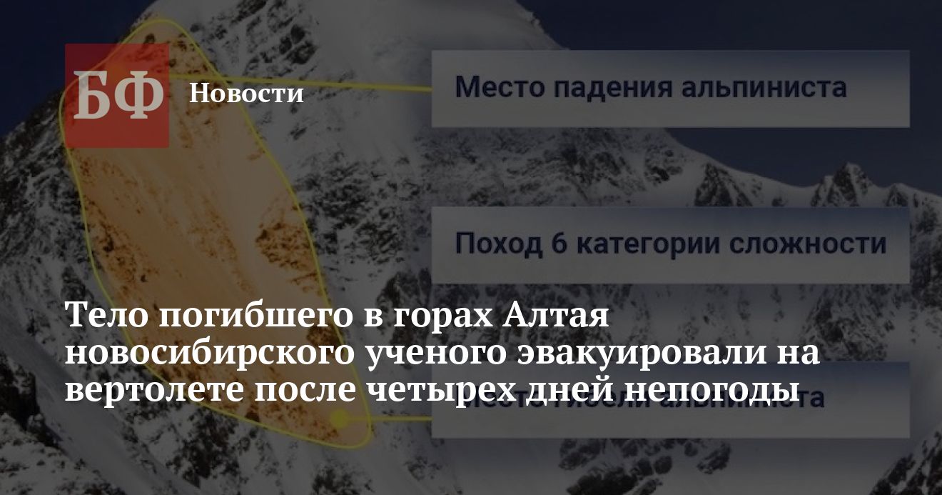 Спасатели завершили работы по эвакуации тела погибшего у вершины Актру новосибирского ученого Георгия Шевелева. Он сорвался с горы еще 10 июля, однако четыре дня силы МЧС не могли подобраться к месту трагедии из-за плохой погоды, сообщается на сайте ведомства.