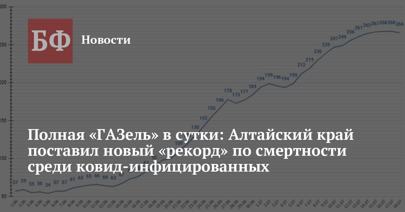 Из 802 новых случаев 266 выявили 18 июля, а 16 и 17 июля — по 268. Лидерами традиционно остаются Барнаул, Бийск и Рубцовск: по 288, 73 и 60 зараженных за трое суток соответственно. Остальные муниципалитеты лишь в единичных случаях показывали прирост более 10 зараженных в сутки. С учетом этих цифр число заразившихся в регионе за все время пандемии составило 58 822 человека. Выздоровело всего 47 973 человека. Погибло 3711 инфицированных, из них 2 709 — непосредственно от коронавируса, а 1002 — по иным причинам. Отметим, что 16 июля был зарегистрирован 21 летальный исход из-за COVID-19, что является новым «рекордом» для региона.