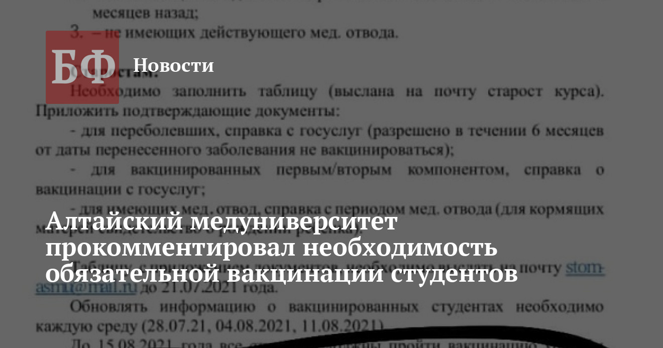 Руководство Алтайского государственного медуниверситета предоставило ИА «Банкфакс» комментарий касательно необходимости обязательного участия студентов в прививочной кампании от ковида. Вуз попытался представить свою позицию как опровержение, однако в сообщении не приводятся факты, свидетельствующие о недостоверности информации.
