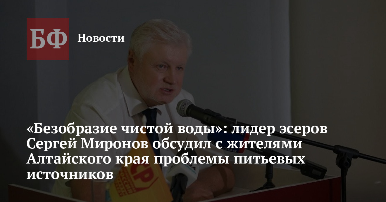 26 июля жители нескольких районов Алтайского края, которым недоступна качественная питьевая вода, стали участниками встречи с лидером партии «Справедливая Россия — За правду» Сергеем Мироновым, который прибыл в регион с рабочим визитом. Представители алтайской глубинки продемонстрировали ему образцы грязной воды с осадком, которую им приходится использовать в пищу, а также рассказали о том, что части жителей она недоступна даже в таком виде из-за слабого напора. При этом платить за ресурс им приходится почти в два раз больше, чем годом ранее. Миронов оценил масштабы проблемы и пообещал помочь в ее решении на федеральном уровне. Кроме того, он обсудил сложившуюся ситуацию вечером того же дня на аудиенции с губернатором Виктором Томенко.