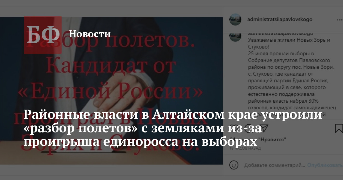 В официальном аккаунте администрации Павловского района в Instagram опубликован пост, посвященный прошедшим накануне дополнительным выборам в районное Собрание депутатов от сел Новые Зори и Стуково. Победу на них одержал самовыдвиженец, бизнесмен Алексей Масликов, который значительно опередил кандидата от «партии власти» Алексея Голубева. Представителей администрации выбор избирателей не устроил и они обратились к ним в соцсетях с вопросом, по какой причине те отказались поддержать единоросса. Причем чиновники открыто заявили, что именно этого кандидата хотели бы видеть победителем, и недвусмысленно дали понять, что этим шагом сельчане могут лишить себя финансовой поддержки района. Выяснить, это ли имели ввиду в представители власти, корреспонденту «Банкфакса» оперативно не удалось — глава администрации Антон Воронов сослался на большую занятость. Зато глава Новозоринского сельсовета Валентин Борисов дал редакции развернутый комментарий и пояснил, почему, по его мнению, люди проголосовали именно так.