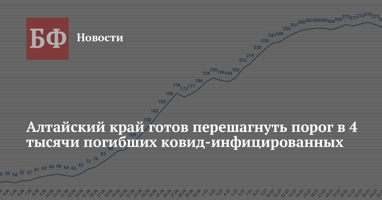 Из 272 новых случаев 77 было выявлено среди жителей Барнаула, 25 — в Бийске, 22 — в Рубцовске, 10 — в Алейске, девять — в Камне-на-Оби, восемь — в Новоалтайске, по семь — в Залесовском и Павловском районах, шесть — в Калманском районе, по пять -в Заринске, Алейске и Чарышском районе, по четыре — в Красногорском, Локтевском, Петропавловском, Поспелихинском, Топчихинском, Тюменцевском, Усть-Пристанском и Целинном районах, по три — в Краснощековском, Первомайском, Рубцовском и Шипуновском районах, по два — в Белокурихе, Алтайском, Змеиногорском, Курьинском, Солтонском, Тальменском, Тогульском и Троицком районах, по одному — в Славгороде, Баевском, Бийском, Бурлинском, Ельцовском, Завьяловском, Зональном, Каменском, Ключевском, Косихинском, Кытмановском, Мамонтовском, Михайловском, Немецком национальном, Новичихинском, Ребрихинском, Родинском, Романовском, Смоленском, Советстком, Солонешенском, Третьяковском, Угловском, Усть-Калманском, Хабарском и Шелаболихинском районах. С учетом этих данных в Алтайском крае за все время пандемии заразились 61 535 человек. Выздоровело 48 833 пациента. Умерло 3914 человек, в том числе 22 — за последние сутки. Из них 2894 пациента скончались непосредственно от COVID-19, а 1020 человек — по иным причинам.