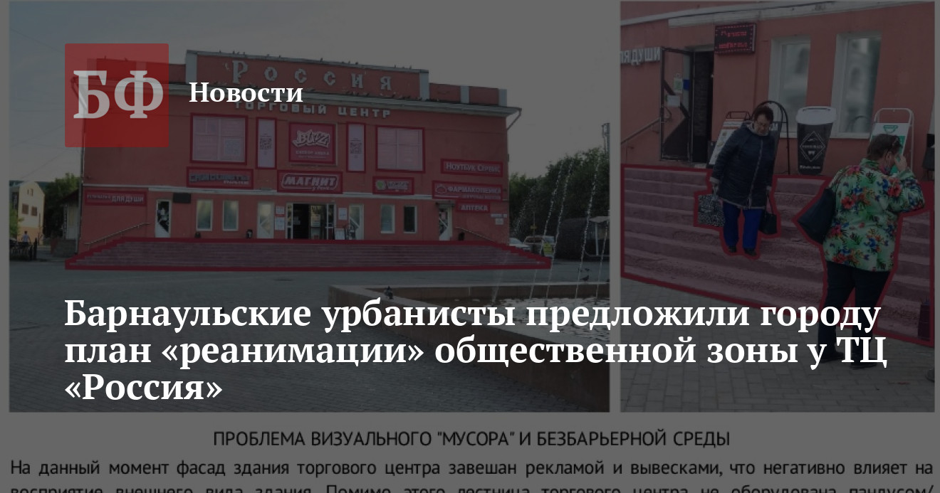 Отделение фонда содействия развитию городов «Городские проекты Ильи Варламова и Максима Каца» в Барнауле исследовало площадку у ТЦ «Россия» и выявило у этой общественной территории множество недостатков. Свои выводы и предложения по их исправлению они направили в адрес главы города Вячеслава Франка. Интересно, что данная локация, несмотря на многолетнее увядание, довольно популярна у барнаульцев, однако в общественное голосование за благоустройство по нацпроекту ее не вносят.