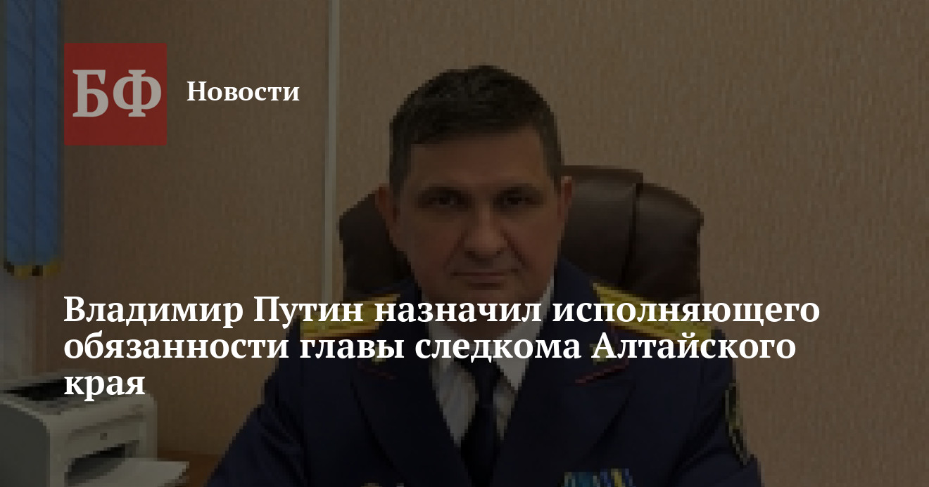 Игорь Колесниченко стал первым заместителем руководителя и исполняющим обязанности главы СУ СКР по Алтайскому краю. Как передает пресс-служба ведомства, президент России Владимир Путин подписал соответствующий указ еще в июле. Данным документом он также освободил от должности Андрея Хвостова, возглавлявшего СУ с 2018 года.