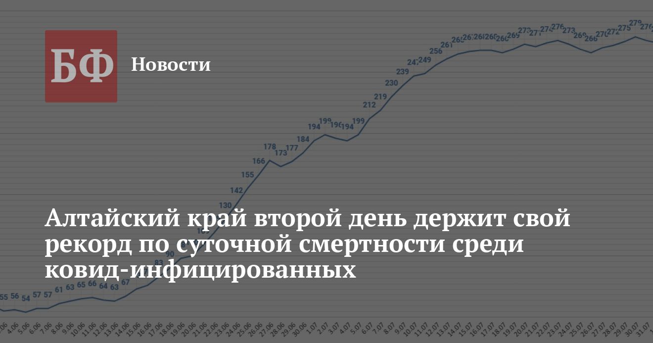 Из 276 новых случаев заражения 98 выявили среди жителей Барнаула, 27 — в Бийске, 22 — в Рубцовске, 14 — в Новоалтайске, 12 — в Алейске, 11 — в Заринске, 10 — в Тальменском районе, восемь — в Косихинском районе, по семь — в Камне-на-Оби, Локтевском и Тюменцевском районах, по шесть — в Баевском, Завьяловском и Первомайском районах, по пять — в Алейском, Бийском и Ребрихинском районах, три — в Топчихинском районе, по два — в ЗАТО Сибирском, Залесовском, Мамонтовском, Троицком, Угловском и Усть-Калманском районах, по одному — в Заринском, Калманском, Крутихинском, Кытмановском и Родинском районах. Таким образом, за все время пандемии в регионе было зарегистрировано 63 467 случаев заражения. Выздоровели всего 49 510 человек. Умерло в общей сложности 4072 пациента, в том числе 25 — за последние сутки. Из них 3036 скончались непосредственно от COVID-19, а 1036 человек — по иным причинам.