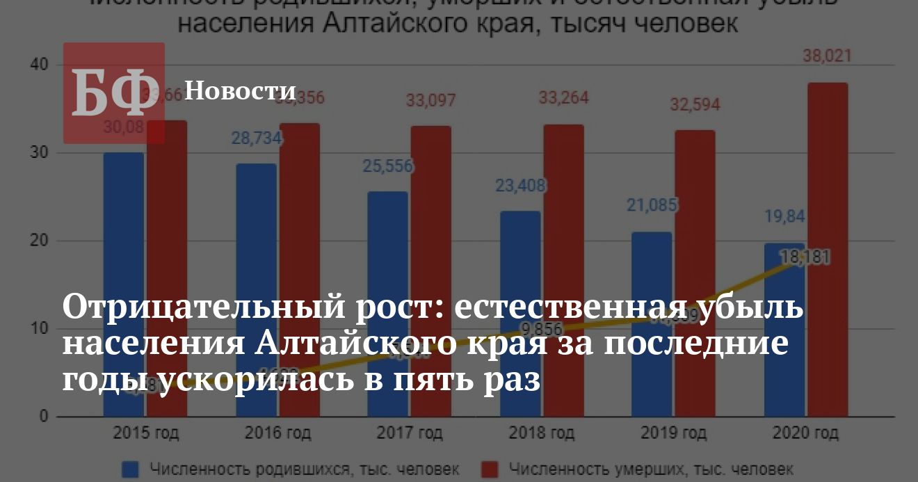 В правительстве Алтайского края представили данные о динамике демографической ситуации за последние шесть лет. Оказалось, что за столь короткий срок рождаемость в крае упала более чем в полтора раза. При этом показатели смертности, напротив, серьезно выросли. В результате естественная убыль населения увеличилась более чем в пять раз — с 3581 человек в 2015 году до 18 181 человек в 2020-м.