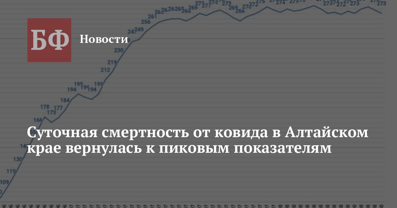 В Алтайском крае за прошедшие сутки зарегистрировано 273 новых случая заболевания коронавирусной инфекцией. Тем временем выздоровело 187 пациентов, а умерло 26 человек, от COVID-19 — 22. Напомним, пока это самый высокий показатель смертность за весь период пандемии. При этом общее число заболевших коронавирусной инфекцией на сегодняшний день составляет 66 774 человек, из них 4614 — дети.