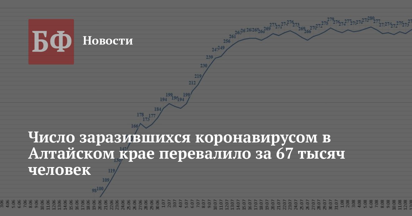 Из 271 нового случая 80 выявили среди жителей Барнаула, 20 — в Бийске, 10 — в Змеиногорском районе, девять — в Заринске, восемь — в Рубцовском районе, по семь — в Алейске, Рубцовске, Волчихинском и Михайловском районах, по шесть — в Бийском, Локтевском, Ребрихинском, Угловском районах, по пять — в Егорьевском, Курьинском, Тальменском и Шипуновском районах, по четыре — в Славгороде, Алтайском, Калманском и Тюменцевском районах, по три — в Камне-на-Оби, Баевском, Ключевском, Косихинском, Мамонтовском, Солтонском, Троицком, Целинном и Шелаболихинском районах, по два — в Белокурихе, Петропавловском, Советском, Табунском и Топчихинском районах, по одному — в Новоалтайске, Благовещенском, Бурлинском, Быстроистокском, Завьяловском, Заринском, Каменском, Краснощековском, Кулундинском, Немецком национальном, Навичихинском, Панкрушихинском, Первомайском, Родинском, Солонешенском, Суетском, Третьяковском, Усть-Калманском и Хабарском районах. С учетом этих цифр в Алтайском крае за весь период пандемии заразилось 67 045 человек. Выздоровело за все время 51 389 пациентов. Всего умерло 4383 человека, в том числе 24 — за последние сутки. Из них 3309 человек умерли непосредственно от COVID-19, а еще 1074 — по иным причинам.