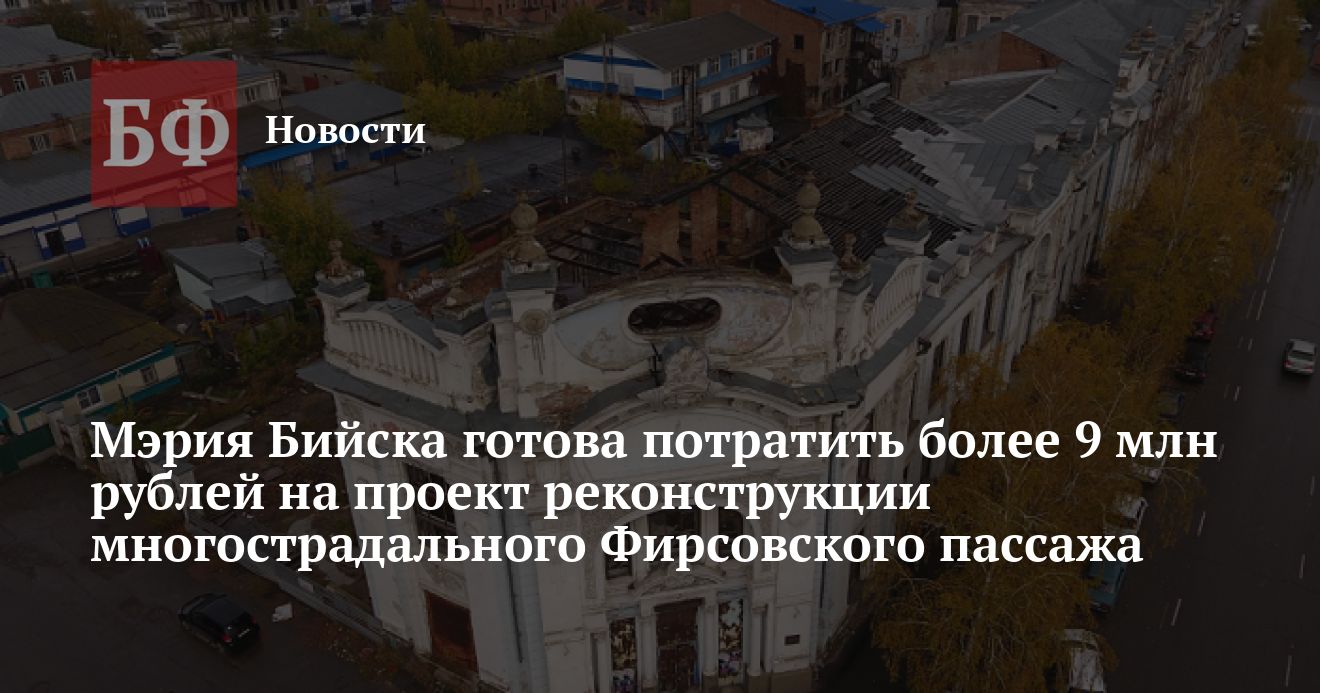 Пассаж Фирсова, находящийся на улице Льва Толстого, 146 в Бийске, является объектом культурного наследия регионального значения. Администрация города объявила тендер на поиск подрядчика, который проведет изыскательные работы, историко-культурную экспертизу и составит проект реставрации здания. Предполагается, что после приведения в порядок его внешнего облика и реализации конструкторских решений оно должно быть приспособлено под современные нужды. Задание по сохранению строения чиновникам выдала Алтайохранкультура, следует из документов. Начальная максимальная цена контракта была установлена ну уровне 9,5 млн рублей. Заявки на участие в аукционе принимаются до 30 августа, а сама процедура пройдет 1 сентября.