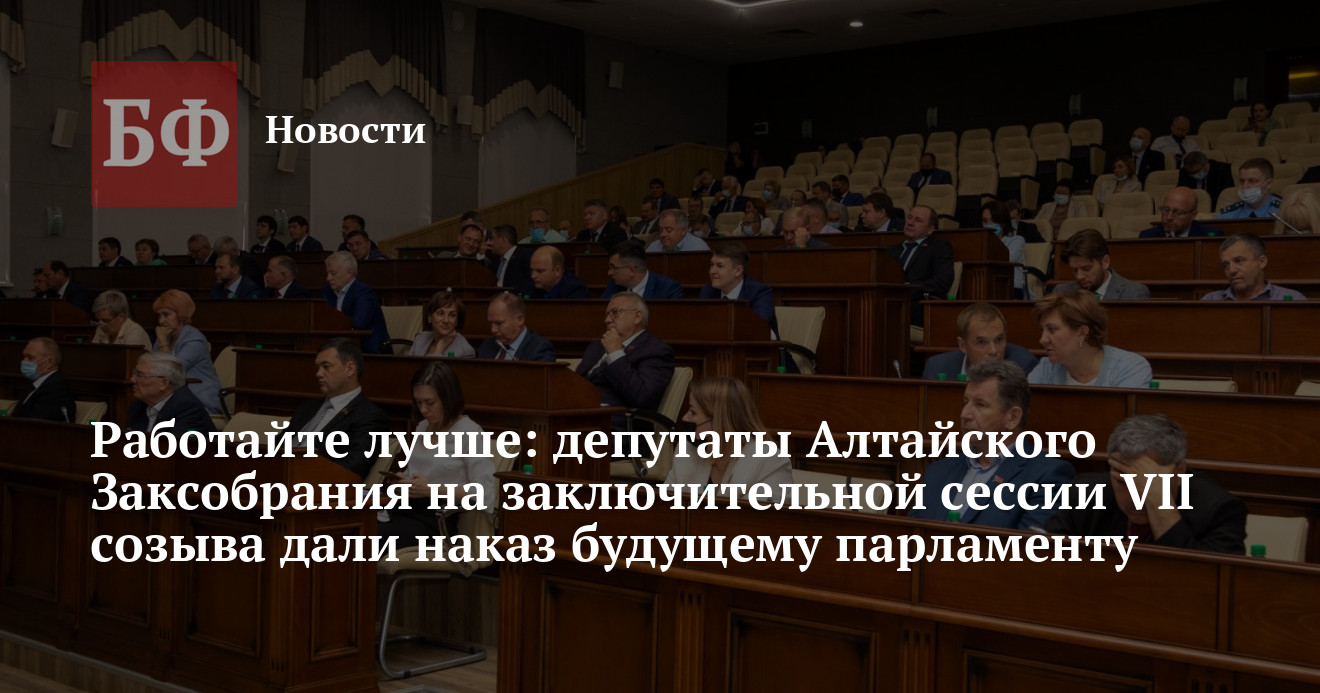 До того, как депутаты АКЗС приступили к рассмотрению законопроектов, слово взял председатель алтайского парламента Александр Романенко. Он подвел краткие итоги работы нынешнего созыва, отметив, что ими было принято наибольшее количество законодательных актов за всю историю краевого законотворчества — 583 документа, которые качественно изменили жизнь населения Алтайского края. Спикер поблагодарил за содействие присутствующего на сессии губернатора края Виктора Томенко, членов правительства, органов государственной власти и общественников, которые внесли свою лепту в корректировку регионального законодательства. Также Романенко отметил, что оценить, насколько хорошо нынешние депутаты справились с поставленной перед ними задачей, ему сложно. Председатель АКЗС признал, что не все получилось так, как хотелось бы, но подчеркнул, что народные избранники очень старались сделать жизнь граждан лучше. По его словам, оценку их деятельности предстоит дать жителям региона. Напоследок он призвал будущий созыв депутатов «работать лучше, эффективнее и настойчивее — во благо родного края».