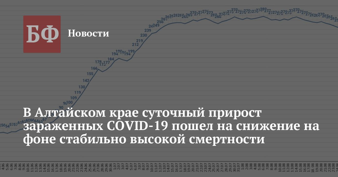 Из 758 случаев 254 выявили 27 августа, 253 — 28 августа, а оставшийся 251 — 29 августа. Как и ранее, лидерами по приросту числа зараженных остаются Барнаул (224 инфицированных за трое суток), Бийск (58 заболевших) и Рубцовск (49 заразившихся). Кроме того, за тот же период с 27 по 29 августа скончались 73 пациента с COVID-19. С учетом этих цифр, в Алтайском крае за все время пандемии заразилось 70 179 человек, выздоровело — 53 216 пациентов. Скончалось 4673 зараженных, из них 3553 — непосредственно от коронавируса, а 1120 — по другим причинам.