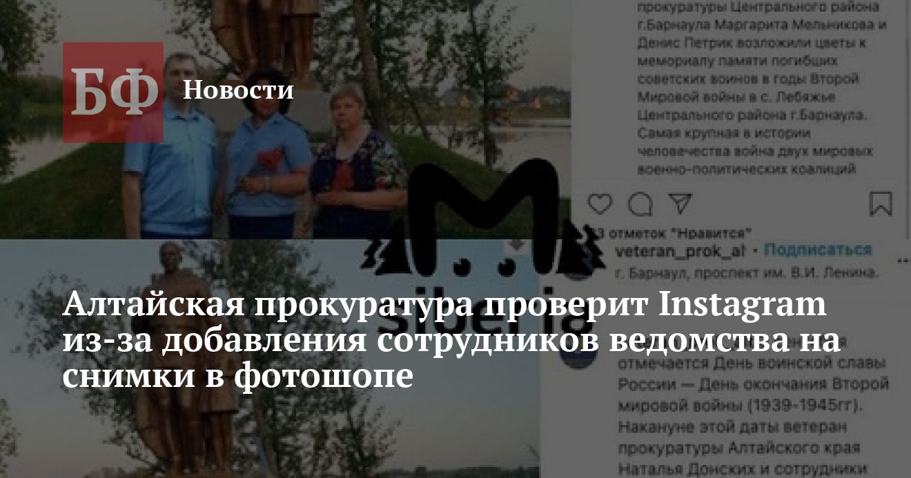 Ранее о постах с фейковыми фото рассказал Telegram-канал Mash Siberia. Одна из последних таких публикаций была размещена на странице алтайского отделения общественной организации ветеранов и пенсионеров прокуратуры в Instagram. В ней сообщалось, что сотрудники отделения ведомства Центрального района Барнаула вместе с ветераном надзорного органа возложили цветы к мемориалу памяти погибших советских воинов в годы Второй Мировой войны, находящемуся в городском селе Лебяжье. Акция прошла 2 сентября — в канун Дня воинской славы России и в день окончания ВМВ.
