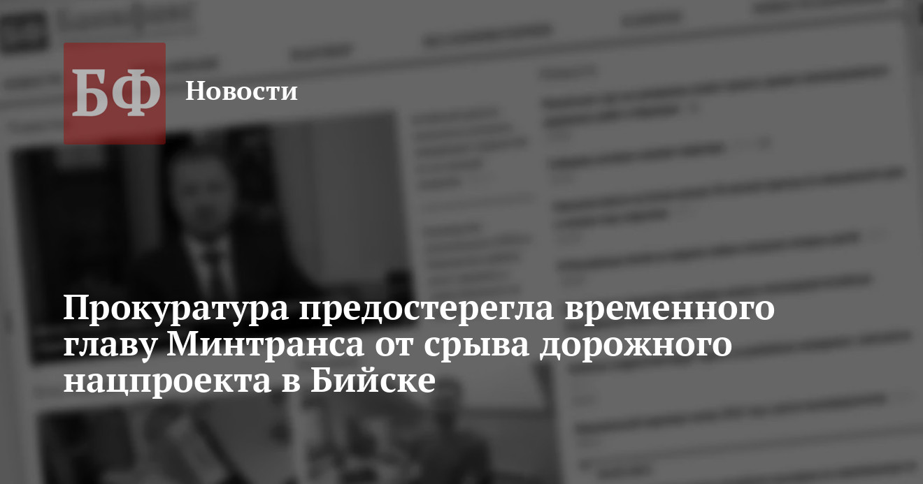 Бийск рискует сорвать очередной нацпроект. На этот раз речь идет о ремонте дорог, который не велся долгое время из-за процедуры банкротства подрядчика ОАО «Дорожно-строительное управление № 1», о котором ранее писало ИА «Банкфакс». Прокуратура Алтайского края провела проверку по данной публикации и выяснила, что реализация госпрограммы в этом году может быть под угрозой. Предостережения уже вынесены исполняющему обязанности министра транспорта Алтайского края Валерию Никитюку и главе Бийске Александру Студеникину.