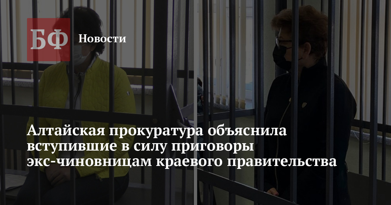 На сегодняшний день обвинительные приговоры в отношении бывших высокопоставленных чиновниц правительства Алтайского края Стеллы Штань и Ирины Долговой вступили в законную силу. Гособвинение не стало оспаривать их условные сроки заключения, осужденные также согласились с вердиктами. В ответе на запрос ИА «Банкфакс» прокуратура региона объяснила, что считает назначенные судом наказания справедливыми, хотя изначально просила о более суровых выводах.