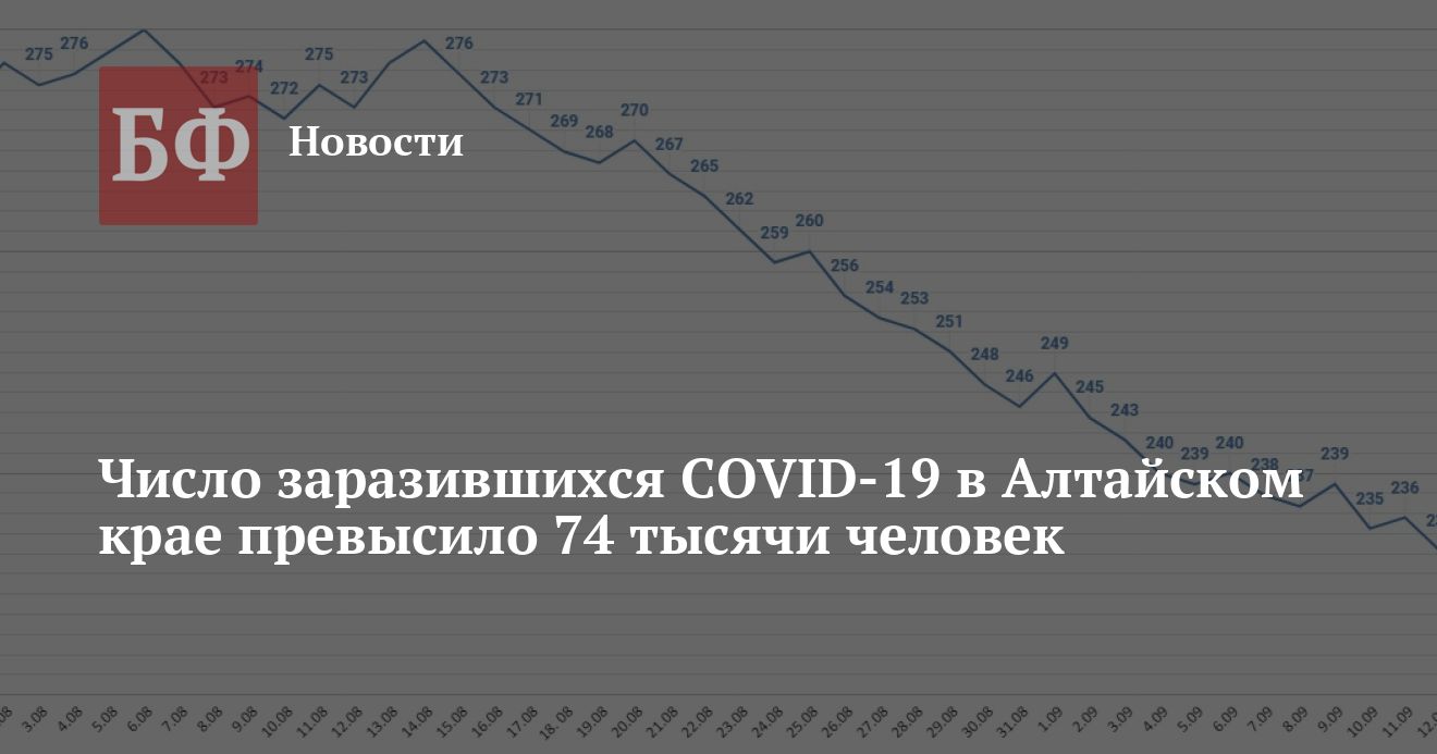 Из 232 новых случаев 62 выявили среди жителей Барнаула, 18 — в Бийске, 15 — в Рубцовске, 12 — в Алейске, 10 — в Новоалтайске, по восемь — в Заринске и Славгороде, шесть — в Шипуновском районе, пять — в Локтевском районе, по четыре — в Алтайском, Бийском, Благовещенском, Ключевском, Павловском, Ребрихинском и Советском районах, по три — в Алейском, Баевском, Волчихинском, Змеиногорском, Зональном, Новичихинском, Первомайском, Рубцовском, Солтонском, Тальменском, Топчихинском, Усть-Пристанском, Целинном и Чарышском районах, по два — в Егорьевском, Краснощековском, Крутихинском, Михайловском, Третьяковском, Тюменцевском и Шелаболихинском районах, по одному — в Ельцовском, Кытмановском, Суетском и Угловском районах. С учетом этих цифр, в Алтайском крае за все время пандемии заразилось 74 011 человек. Выздоровело в общей сложности 57 092. Умерло 5065 человек, в том числе 22 — за последние сутки. Из них 3887 погибли непосредственно от коронавируса, а 1178 — по иным причинам.