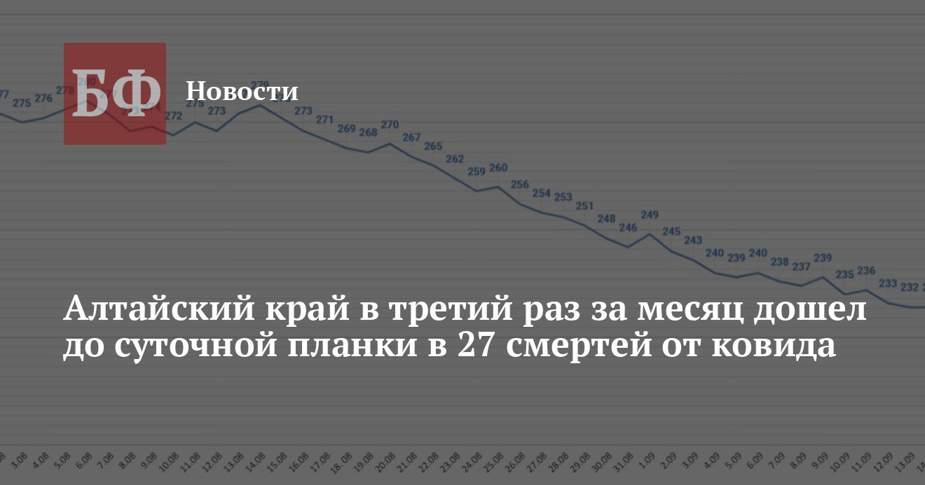 16 сентября в крае зафиксировали 236 положительных результатов тестов на COVID-19. Барнаул — 62, Бийск — 24, Рубцовск — 22, Славгород — 13, Алейск — 11, Новоалтайск — восемь, Заринск — семь, Бийский, Михайловский, Первомайский районы — по пять, Волчихинский, Змеиногорский, Локтевский, Павловский, Ребрихинский, Рубцовский, Тальменский районы — по четыре, Благовещенский, Бурлинский, Егорьевский, Кулундинский, Курьинский, Кытмановский, Поспелихинский, Табунский, Тюменцевский, Угловский районы — по три, Камень-на-Оби, Калманский, Ключевской, Панкрушихинский, Топчихинский районы — по два, Косихинский, Немецкий национальный, Тогульский, Третьяковский, Троицкий, Хабарский районы — по одному.