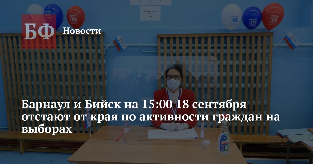 Общая явка по Алтайскому краю на 15:00 составила 18,25%, однако в разрезе муниципальных образований заметен большой разрыв в показателях. Так, явка по городам составила 14,7%, а по сельским районам — 22,4%. ЗАТО Сибирский по-прежнему сохраняет за собой статус лидера — явка здесь составила 51,2%. Чуть ниже показатели в Родинском (38,9%) и Завьяловском (38,3%) районах. Наименьшую активность проявляют избиратели в Барнауле и Бийске (по 13,4%). Недалеко от них ушел и Первомайский район, где явка составила 14%. Отметим, что за первый день голосования явка к 15:00 по краю составляла уже 7,64%, а к 20:00 — 11,64%.