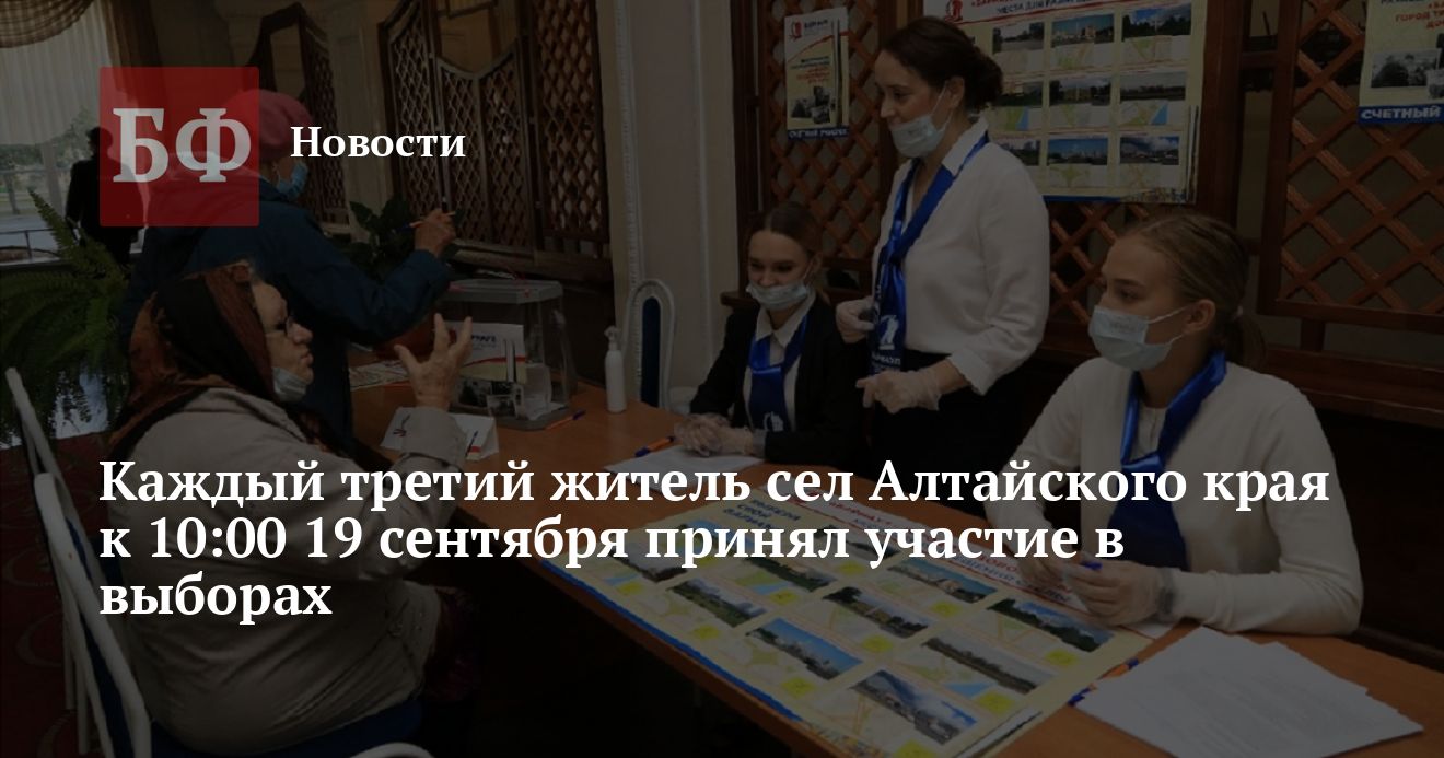 По данным Ирины Акимовой, в среднем явка в сельских территориях на 10:00 составила 29,6%. Наиболее активно на данный момент голосуют жители следующих сельских МО: Алейский район — 40,2%, Баевский район — 31,8%, Благовещенский район — 32,5%, Бурлинсккий район — 32,8%, Быстроистокский район — 31,5%, Ельцовский район — 37,5%, Завьяловский район — 46%, Заринский район — 31,9%, Краснощековский район — 37,8%, Крутихинский район — 32,8%, Кытмановский район — 36,2%, Немецкий национальный район — 36,3%, Новичихинский район — 33,5%, Панкрушихинский — 35,6%, Суетский район — свыше 45%, Тюменцевский район — 40,6%, Целинный район — 34,8%.