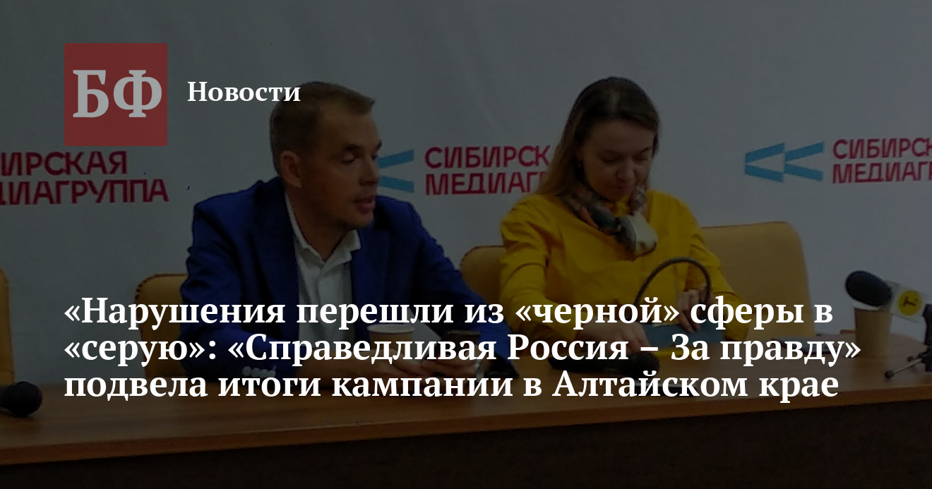 Лидер фракции «Справедливой России — За правду» в Алтайском Заксобрании Александр Молотов считает прошедшую в крае избирательную кампанию неоднозначной. Как он рассказал на пресс-конференции в «Сибирской медиагруппе», с одной стороны, использование административного ресурса было менее очевидным и его сложно охарактеризовать как нарушения, с другой, сами избиратели стали относиться к политикам иначе, более полярно, так что до них сложнее было донести свою точку зрения. Его коллега Оксана Молодых поддержала это мнение и отметила, что порой подготовка членов избиркомов была недостаточной.