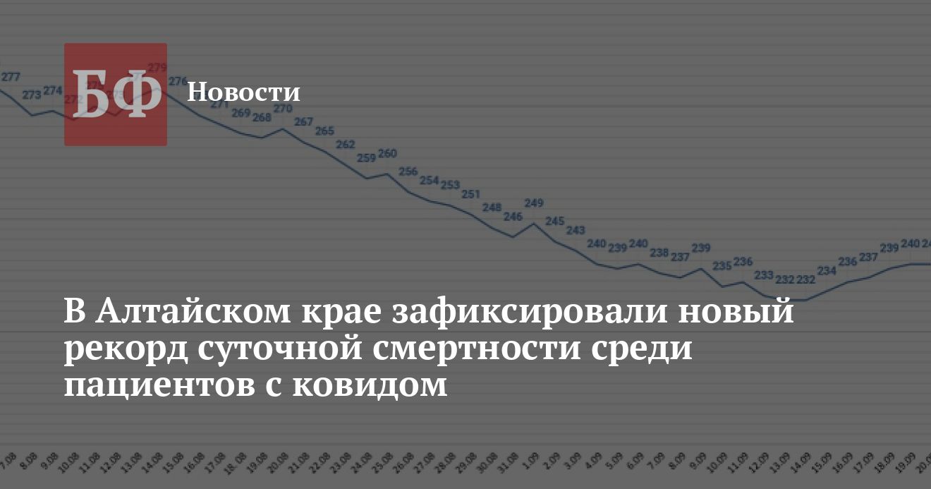 Оперштаб Алтайского края отчитался о том, что за прошедшие сутки в регионе умерло рекордное число людей с коронавирусной инфекцией — 28. При этом было зарегистрировано 240 новых случаев заболевания, а выздоровело за день 375 пациентов. Общее число зараженных в крае составляет 75 437 человек, в том числе 5415 детей.