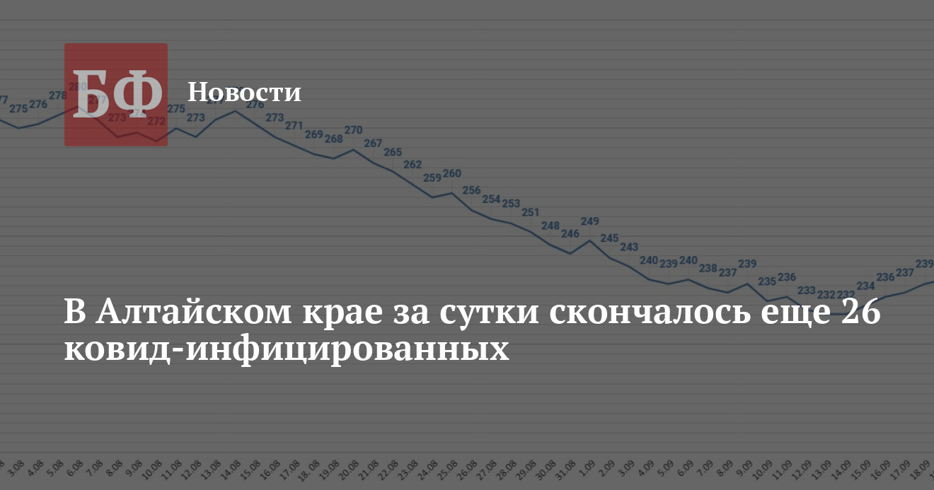 Из 243 случаев 67 выявили среди жителей Барнаула, по 16 — в Бийске и Рубцовске, по 15 — в Алейске и Заринске, по восемь — в Павловском и Рубцовском районах, семь — в Поспелихинском районе, по шесть — в Змеиногорском, Михайловском, Усть-Калманском и Шипуновском районах, по пять — в Алейском, Курьинском и Троицком районах, по четыре — в Бийском, Благовещенском, Волчихинском, Новичихинском, Угловском и Чарышском районах, по три — в Ельцовском, Тальменском и Топчихинском районах, по два — в Алтайском, Локтевском, Родинском, Смоленском и Целинном районах, по одному — в Белокурихе, Бурлинском, Быстроистокском, Егорьевском, Зональном, Ключевском, Мамонтовском, Петропавловском и Ребрихинском районах. С учетом этих цифр общее число заразившихся за все время пандемии в Алтайском крае достигло 75 680 человек. Из них выздоровело 58 567 пациентов. Еще 5244 инфицированных погибли, в том числе 26 за последние сутки. Из них 4041 человек скончался непосредственно от COVID-19, а еще 1203 человека — от иных причин.