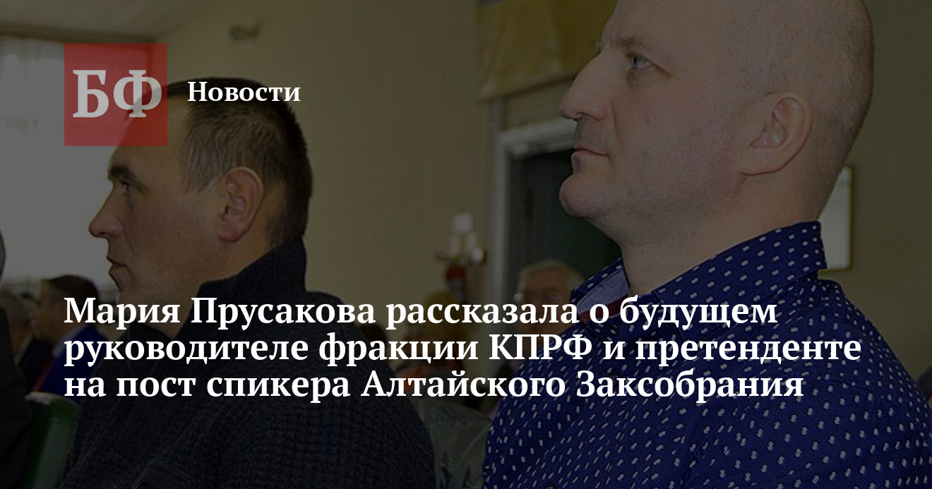 Кроме того, Мария Прусакова рассказала и о кандидате коммунистов на должность спикера Заксобрания. КПРФ будет предлагать на этот пост 63-летнего Юрия Кропотина, победившего на выборах по округу № 28 единоросса Альберта Лунева. Кропотин возглавляет Центральный райком партии в Барнауле, живет в поселке Южном и является исполнительным директором компании «Альфа Механик». Прусакова охарактеризовала его как «очень хорошего товарища с большим управленческим опытом и двумя высшими образованиями».