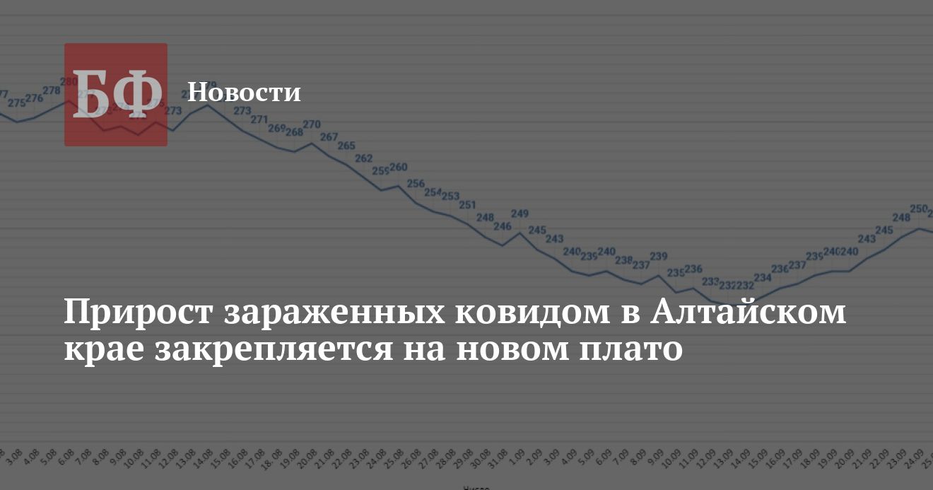 По данным на 27 сентября, дневной прирост инфицированных граждан составил 248. По муниципалитетам: Барнаул — 74, Бийск — 25, Рубцовск — 23, Заринск — 12, Алейск, Калманский район — по 8 заболевших, Змеиногорский, Павловский, Табунский районы — по семь, Яровое, Топчихинский, Третьяковский, Чарышский районы — по пять, Камень-на-Оби, Новичихинский район — по четыре, Ключевский, Красногорский, Михайловский, Солтонский, Шелаболихинский районы — по три, Новоалтайск, Алейский, Бийский, Егорьевский, Зональный, Немецкий национальный, Первомайский, Тальменский, Троицкий, Усть-Калманский районы — по два, ЗАТО Сибирский, Волчихинский, Ельцовский, Залесовский, Каменский, Косихинский, Краснощековский, Крутихинский, Кулундинский, Кытмановский, Поспелихинский, Ребрихинский, Угловский, Шипуновский районы — по одному.