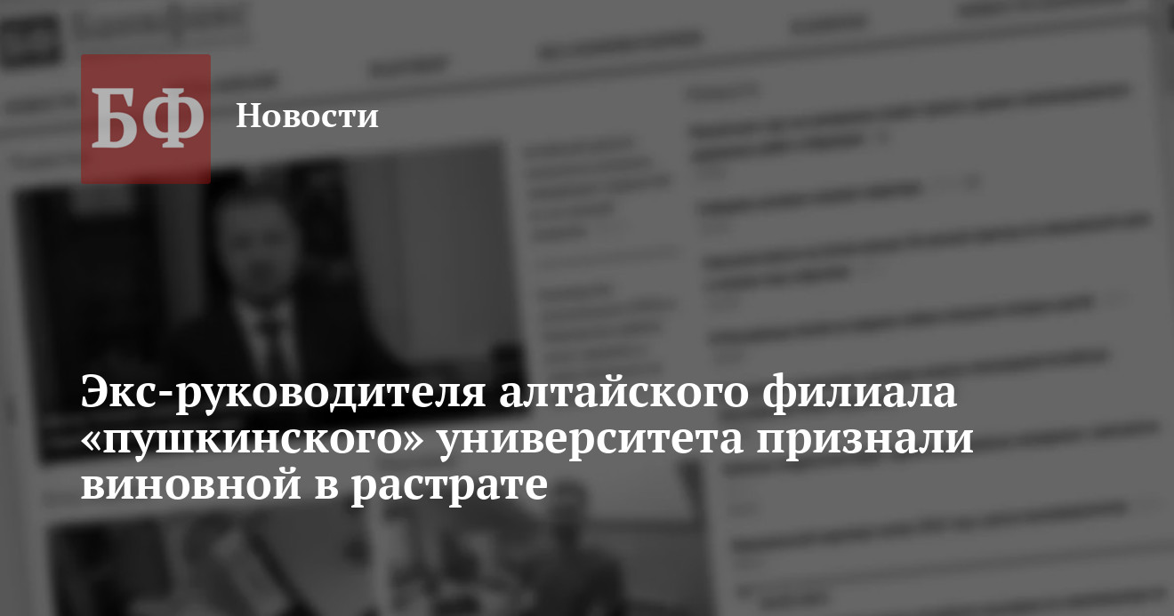 Разбирательство в отношении фигурантки завершилось 4 октября. В Индустриальном районном суде Барнаула «Банкфаксу» сообщили, что главу филиала «пушкинского» вуза признали виновной и приговорили к 3 годам лишения свободы условно с таким же испытательным сроком, а также штрафу в 300 тысяч рублей. В качестве дополнительного наказания женщине запретили занимать руководящие должности на 2 года.