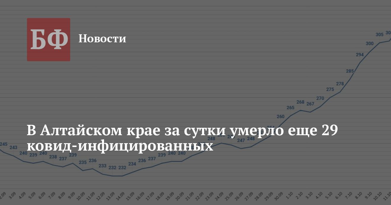 С учетом этих цифр в Алтайском крае за все время пандемии заразились 81 683 человека, из них выздоровели 60 198. Умерло в общей сложности 5810 пациентов, в том числе 29 — за минувшие сутки. Из них 4501 человек умер непосредственно от COVID-19, а еще 1309 — по иным причинам.