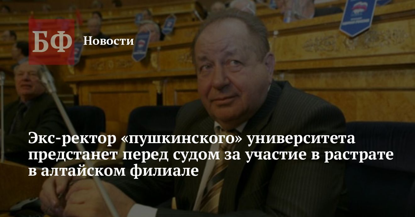 Прокуратура Алтайского края утвердила обвинительное заключение в отношении бывшего ректора ГАОУ ВПО «Ленинградский государственный университет имени А.С. Пушкина» Вячеслава Скворцова. Его обвиняют в растрате, связанной с алтайским филиалом вуза, сообщает надзорное ведомство. Напомним, бывшего руководителя ЛГУ в Алтайском крае Ирину Соловьеву уже признали виновной. Ей назначили условный срок лишения свободы.
