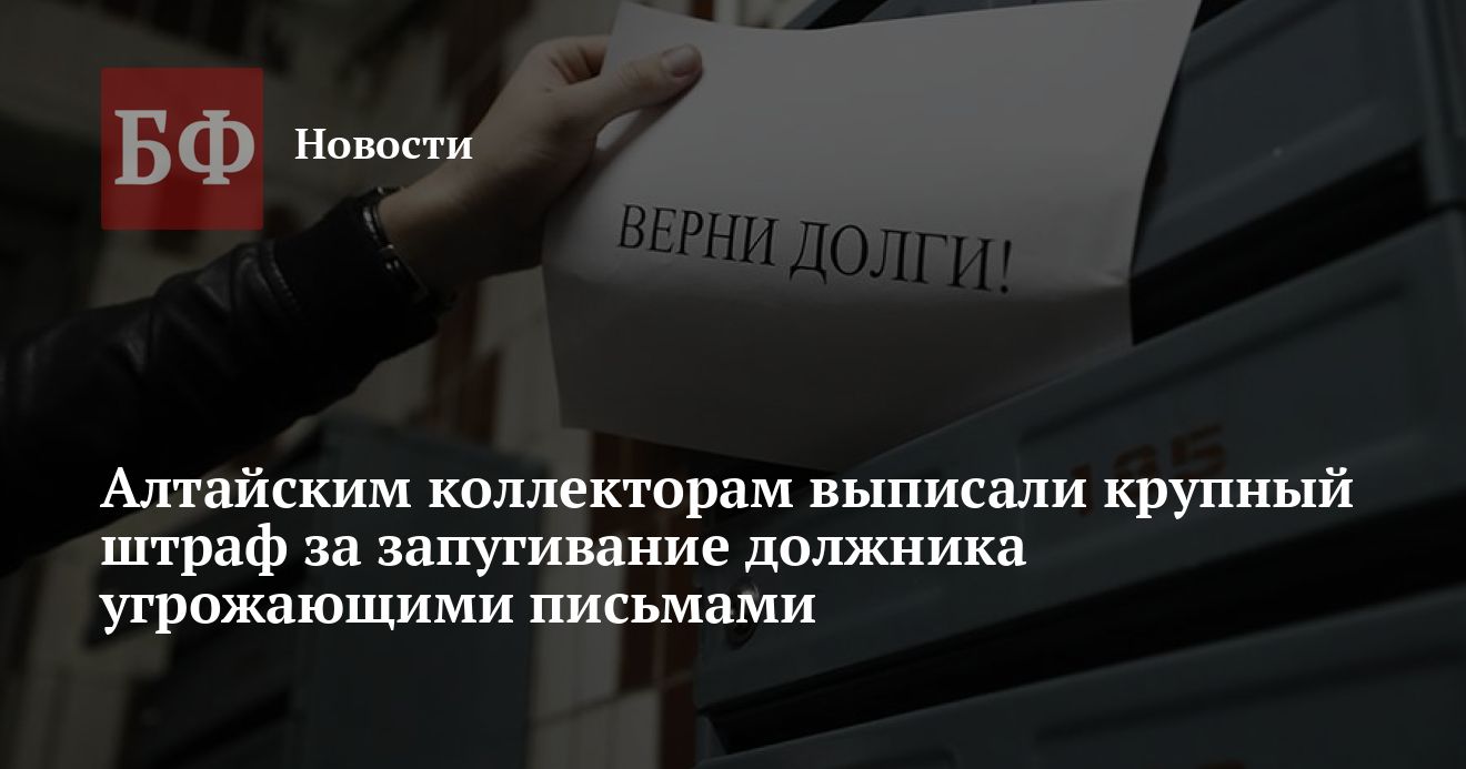 В Алтайском крае коллекторской компании ООО «Региональная служба взыскания» назначили административный штраф в размере 60 тысяч рублей за то, что ее сотрудники пользовались незаконными методами «выбивания долгов». Как сообщили в управлении Федеральной службы судебных приставов по Алтайскому краю, коллекторы направляли должнику почтовые уведомления и sms с целью оказания психологического давления, чтобы тот поскорее рассчитался.