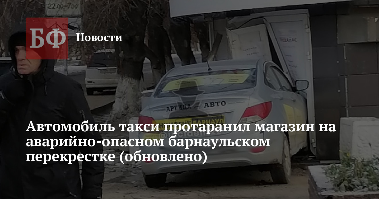 UPD 12:09: Как рассказала в сообществе «В Курсе 22» пассажирка попавшего в аварию такси, они ехали на зеленый свет, когда в их авто врезался внедорожник. «Мы ехали на зеленый, мужчина (на внедорожнике — прим. ред. ИА „Банкфакс“) завершал маневр, не увидел, что мы ехали, и влетел в нас, он удара нас швырнуло в магазин. Причем нас пытались вытащить и пытались помочь все, кроме водителя того автомобиля. Когда меня вытащили, водитель начал на меня орать: почему мы ехали на красный. Будьте внимательнее на дорогах, пожалуйста. И слава богу, что никто не пострадал и что именно в этот момент никто не шел возле магазина».