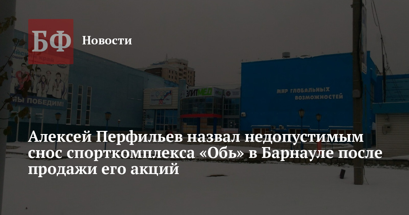 Алексей Перфильев рассказал, что в связи с продажей Крайсовпрофом 49% акций расположенного в центре города спорткомплекса земля под ним, конечно, может быть интересна частным инвесторам для использования не по спортивному профилю. Однако министр подчеркнул, что контрольный пакет все еще находится в руках правительства региона и власти ни при каких обстоятельствах не допустят сноса «Оби». «51% акций этого спортивного социального объекта принадлежит правительству Алтайского края. Это гарантия того, что спортивный профиль объекта будет сохранен. Вторично, кто и за сколько приобрел оставшуюся часть акций. Я прекрасно знаю ситуацию изнутри. Уверяю, что мы можем заблокировать любые попытки использовать объект новым инвестором не по спортивному назначению», — заверил Перфильев.