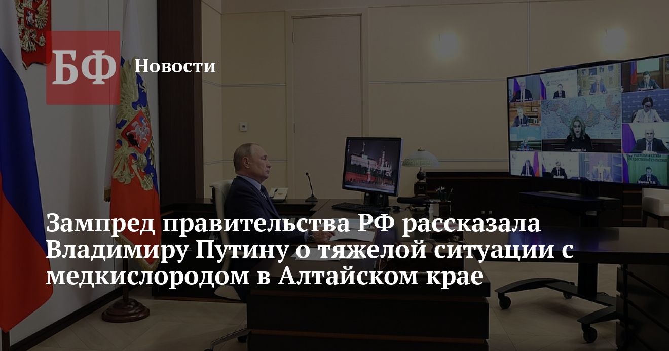Наиболее тяжелая ситуация с доступностью медицинского кислорода наблюдается в пяти российских регионах, среди которых и Алтайский край. Об этом вице-премьер правительства РФ Татьяна Голикова заявила на онлайн-совещании президента Владимира Путина с членами кабмина, сказано на сайте Кремля. По ее словам, федеральная власть координирует действия по устранению дефицита.