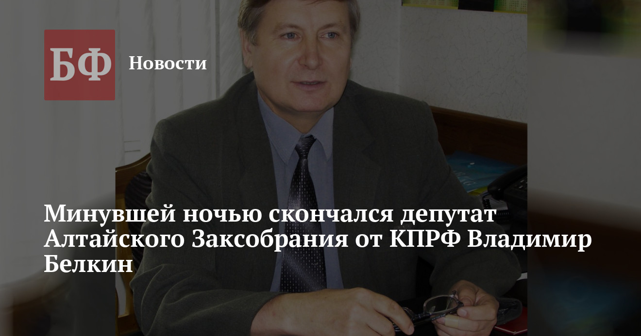 В ночь на 12 ноября от коронавируса ушел из жизни член фракции КПРФ Алтайского Заксобрания, представитель Рубцовска в региональном парламенте Владимир Белкин. Об этом стало известно ИА «Банкфакс», информацию подтвердила его коллега по депутатскому объединению Вероника Лапина.