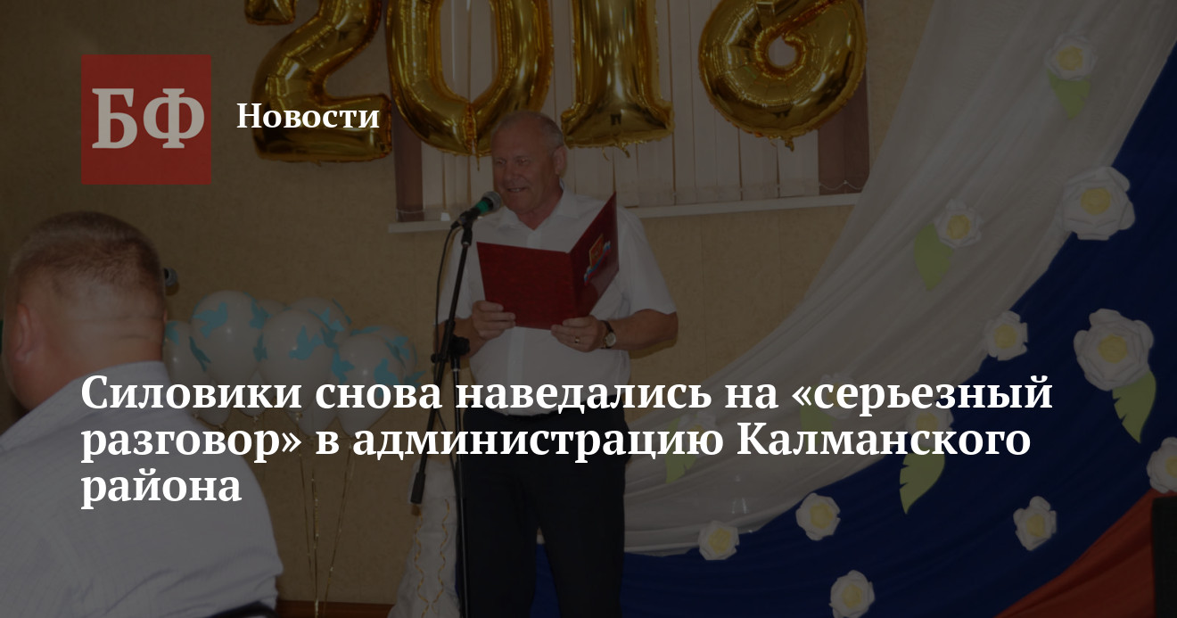 11 ноября администрацию Калманского района снова посетили силовики. Как утверждают источники «Банкфакса», их интерес мог быть обусловлен как незаконными премиями, которые глава района Сергей Бунет выписывал сам себе, так и работой одного из местных МУПов. В администрации агентству подтвердили, что правоохранители работали в здании и серьезно беседовали с отдельными сотрудниками, но не смогли объяснить, что послужило причиной для визита. По сведениям редакции, в скором времени может быть возбуждено уголовное дело, фигурантами которого рискуют стать представители верхушки районной власти.