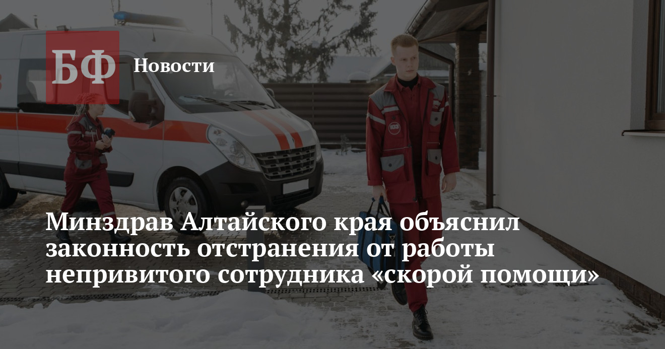 Сотрудника одной из подстанций «скорой помощи» Барнаула отстранили от работы с 15 ноября после жалоб в Сети на то, что начальство будто бы заставляет его и коллег агитировать за вакцинацию от коронавируса. В Минздраве свои действия объясняют отсутствием у него самого прививки от COVID-19.