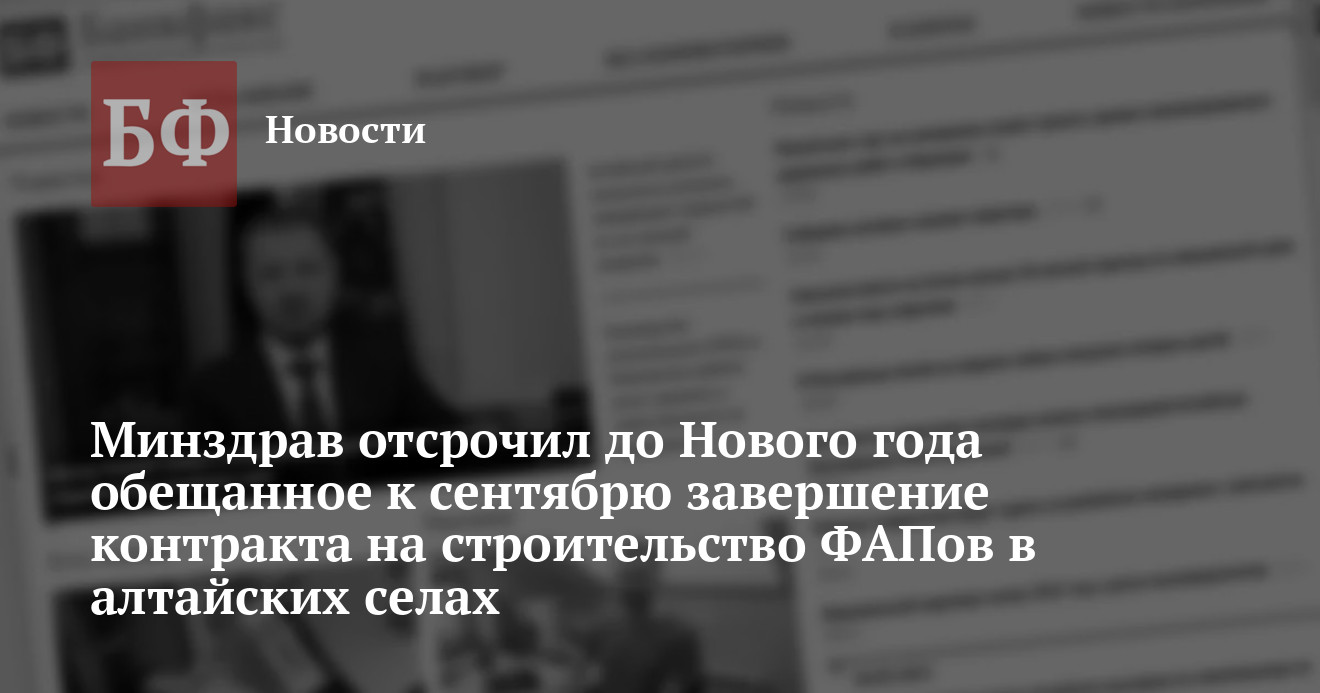 Строительство девяти модульных фельдшерско-акушерских пунктов в селах Алтайского края по контракту с Минздравом должно было завершиться еще до начала осени, но договор до сих пор не исполнен. Ранее на проблему затянувшихся работ обратил внимание «Общероссийский народный фронт», активисты которого обратились в прокуратуру с просьбой провести проверку еще в конце сентября. По данным портала Госзакупок, недавно срок окончания работ перенесли на 31 декабря.