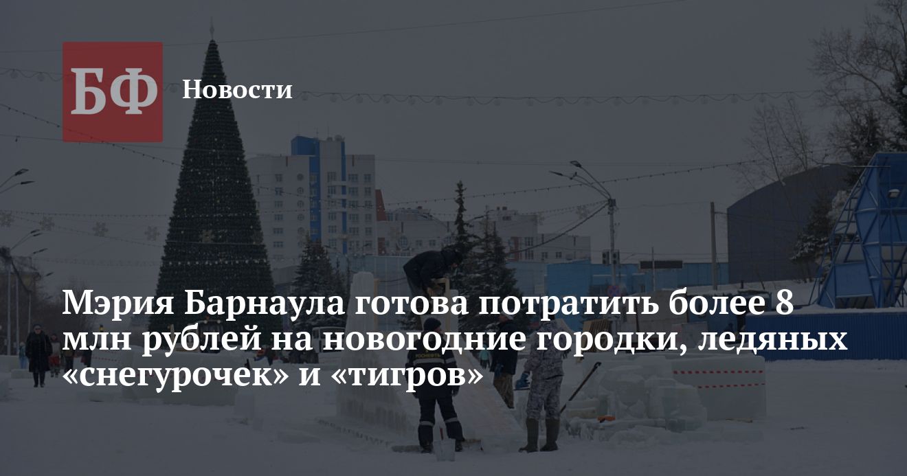 Комитет по дорожному хозяйству, благоустройству, транспорту и связи Барнаула объявил конкурс на строительство главного городского новогоднего городка. Бюджетом города на эти цели предусмотрено 8,2 млн рублей, сообщает пресс-центр мэрии. Как следует из информации на сайте Госзакупок, аукцион назначен на 1 декабря, и как только контракт будет подписан, рабочие должны начать устанавливать ледяные фигуры.