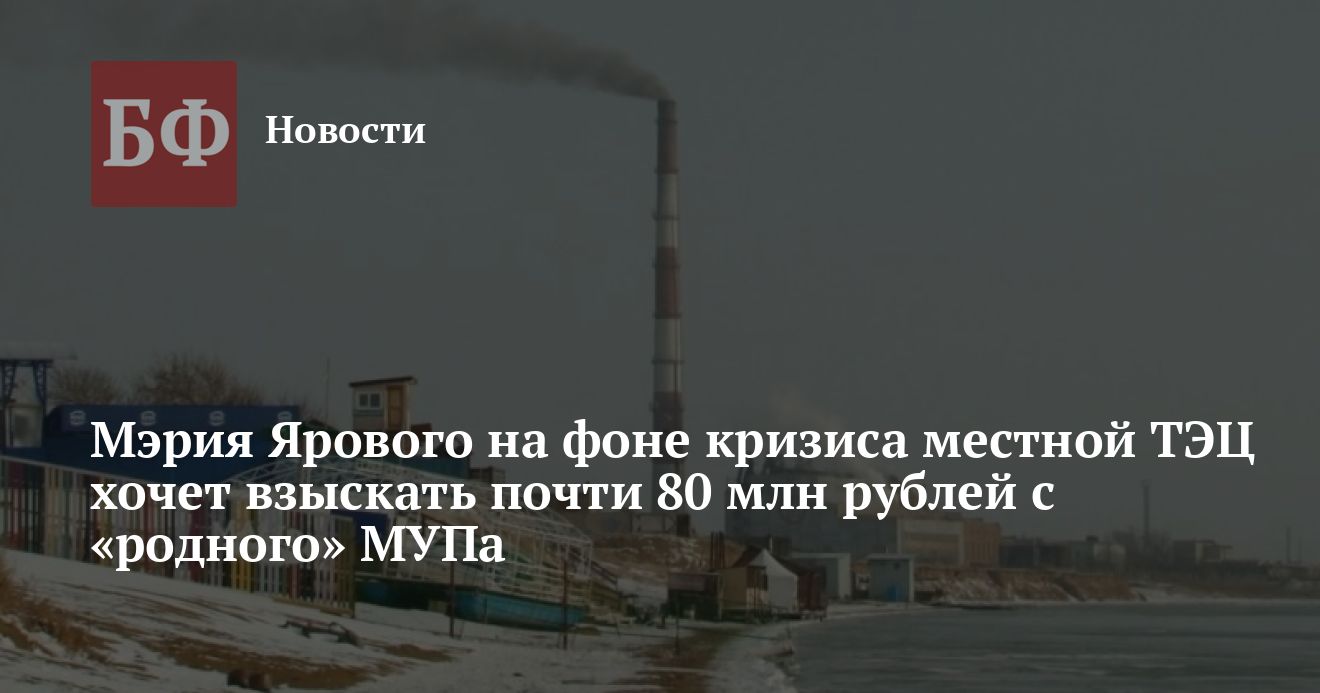 На сайте Арбитражного суда появилась запись об иске мэрии Ярового к учрежденному ею же МУП «ЯТЭК», эксплуатирующему местную ТЭЦ. Администрация требует с организации почти 80 млн рублей. Документы, по которым можно было бы сделать вывод о характере претензий чиновников, в деле пока отсутствуют. В самой горадминистрации «Банкфаксу» пока также не смогли оперативно объяснить, с чем связано их заявление.