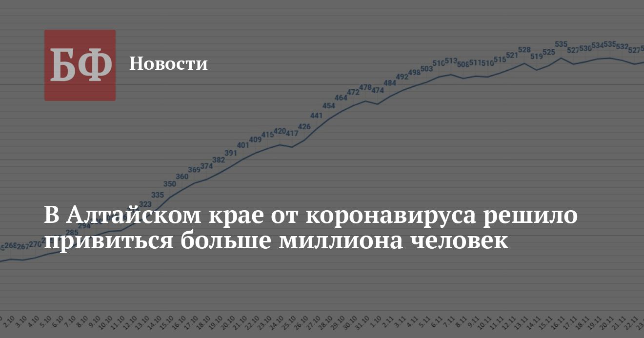В общей сложности в Алтайский край для медицинских организаций поступило 1 233 523 комплекта вакцины против коронавирусной инфекции. На утро 26 ноября прививается 1 005 957 человек, из них 134 031 человек получили первую прививку, а 830 357 человек полностью привиты (получили две прививки или однократно «Спутник Лайт»). Еще 41 569 человек прошел повторную вакцинацию.